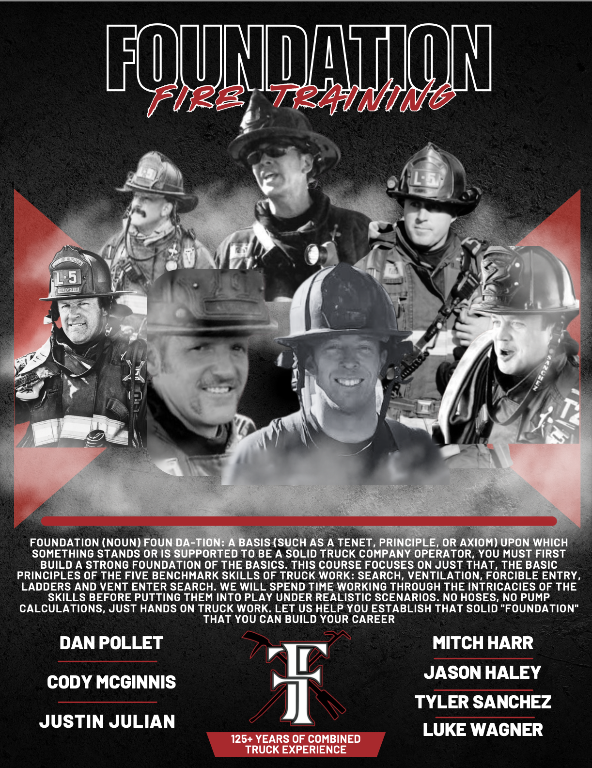 FOUNDATION (NOUN) FOUN DA-TION: A BASIS (SUCH AS A TENET, PRINCIPLE, OR AXIOM) UPON WHICH SOMETHING STANDS OR IS SUPPORTED TO BE A SOLID TRUCK COMPANY OPERATOR, YOU MUST FIRST BUILD A STRONG FOUNDATION OF THE BASICS. THIS COURSE FOCUSES ON JUST THAT, THE BASIC PRINCIPLES OF THE FIVE BENCHMARK SKILLS OF TRUCK WORK: SEARCH, VENTILATION, FORCIBLE ENTRY, LADDERS AND VENT ENTER SEARCH. WE WILL SPEND TIME WORKING THROUGH THE INTRICACIES OF THE SKILLS BEFORE PUTTING THEM INTO PLAY UNDER REALISTIC SCENARIOS. NO HOSES, NO PUMP CALCULATIONS, JUST HANDS ON TRUCK WORK. LET US HELP YOU ESTABLISH THAT SOLID “FOUNDATION” THAT YOU CAN BUILD YOUR CAREER.